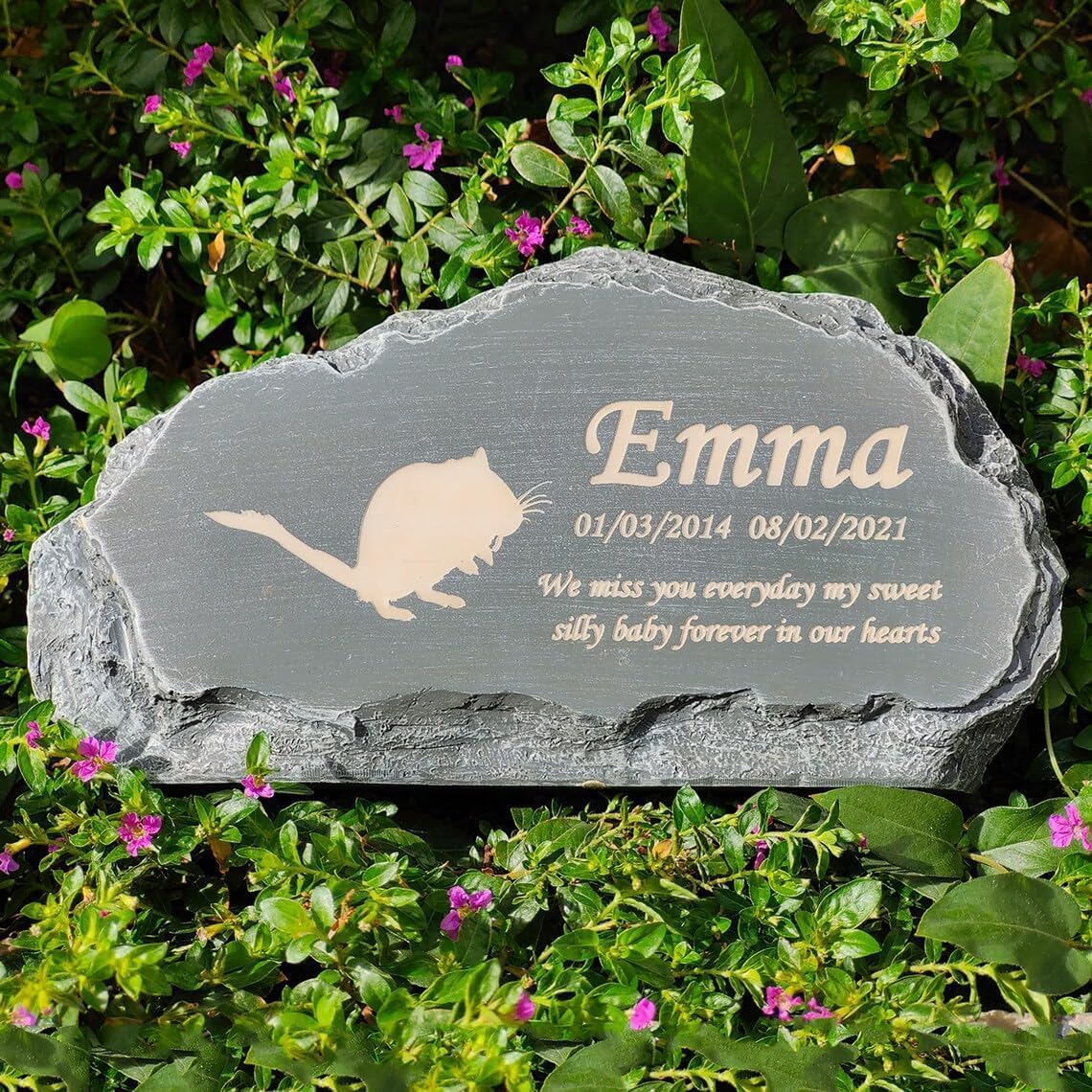 ♥Custom Pet Memorial Tombstone -- Custom pet name date and sentence.Size: 8 x 4.5 x 2.5 inches; Weight: 0.75 pounds. This pet memorial stone is suitable for dog cat hamster bird turtle sheep horse fish duck rabbit cow and any animal you can choose the pattern in our template. Also can send us pet photo via message we can design it for you and send you the picture to you to confirm.♥Loss of Pet Memorial Gifts -- The pet memorial stone like a rockery. Pet are our most special friends and companions. This Pet Memorial Stone can help a sad friend or lover to remember their loved pet is great as memorial decoration for your pet friend who has long passed away sharing Good memories and emotions together.♥Material -- The pet grave maker is made of premium resin durable hard to be damaged deformed fade or break waterproof UV resistant. Making the dog memorial stone perfect for set on lawn yard garden outdoor and indoor table shelf etc.♥Multi-Application -- The pet memorial garden stone easily displays in your garden. Put cat memorial headstone alongside the walkway near a flower bed under your favorite tree on a porch or patio on table or your book shelf etc. You can also use the memory plaque at pet funerals memorial services other anniversaries.