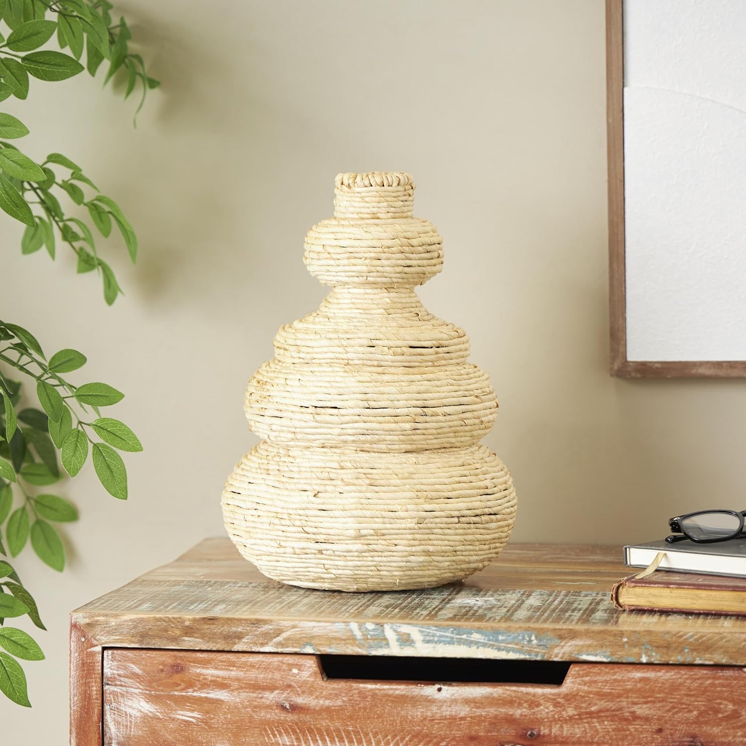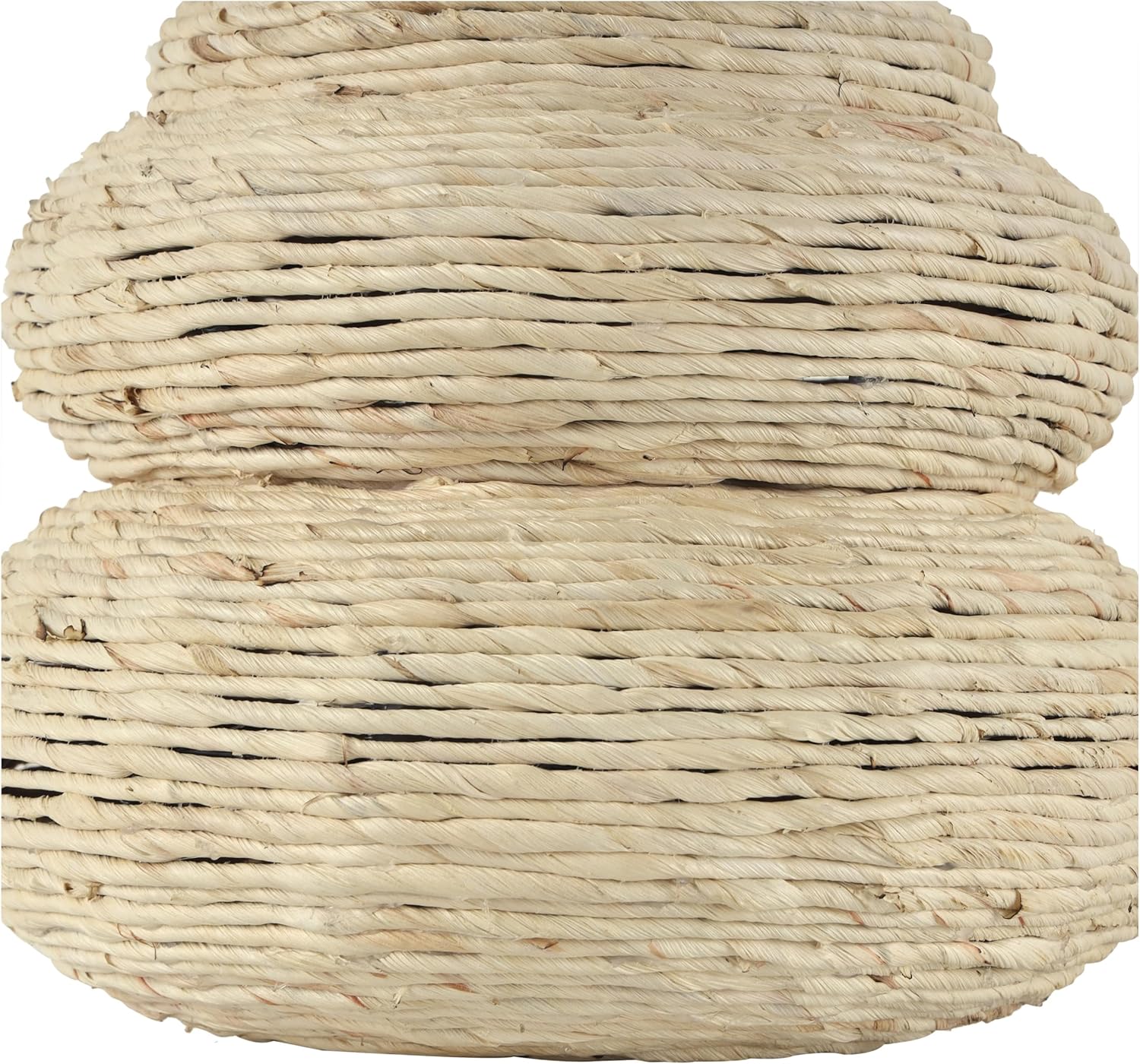 The bohemian vase for home decor is handmade using MDF with corn rope wrapped around it. The textured beige vase for decoration has an intriguing asymmetrical bubble shape and rope pattern that adds a touch of style to your home. Wipe clean with a dry cloth. Perfect for any living room or dining area, the beige centerpiece vase offers a unique style. This item ships in 1 carton. Seagrass vase makes a great gift for any occasion. Due to the handmade nature of this item, no two will be alike, there will be slight differences in shape, size, and color. Suitable for indoor use only. This item ships fully assembled in one piece. This is a single beige colored vase. Bohemian style. Vase has a 1.60 in mouth opening.