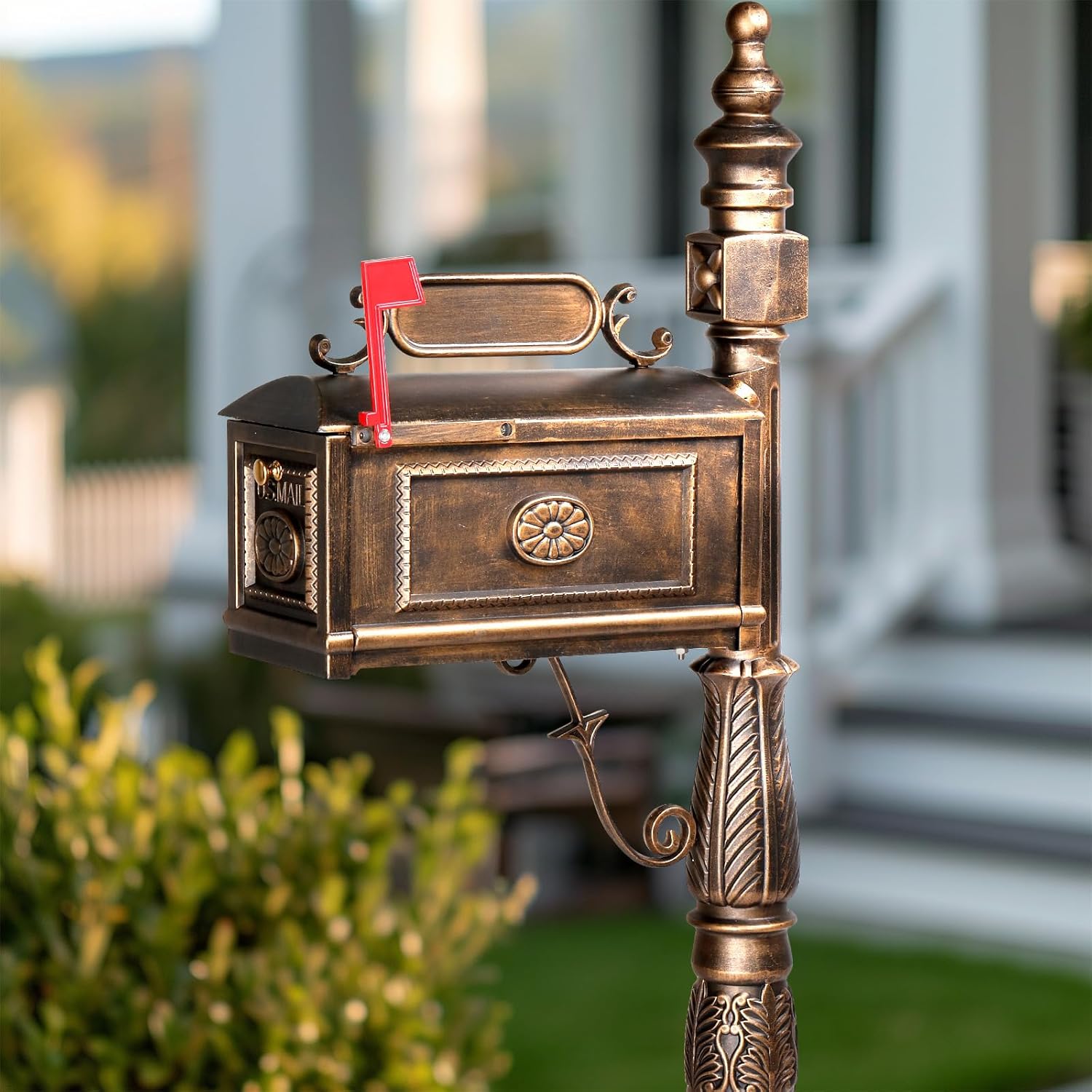 Are you looking for a durable, elegant, and classic mailbox for your home? If so, this UIKJIM Decorative Large Mailbox with Post is the perfect choice for you. This mailbox is made of high-quality cast aluminum, which is strong and sturdy, and can withstand harsh weather conditions. The antique bronze powder coat finish prevents rust and corrosion, and adds a touch of elegance to your outdoor space. This mailbox has a graceful and refined design, with intricate details and curves on the surface. The antique bronze finish gives it a vintage and classy look, which enhances the curb appeal of your home. This mailbox features an address plaque on the front, which allows you to display your house number or address, ensuring efficient mail delivery and adding a personalized touch. The mailbox also has a red signal flag, which alerts your mail carrier when you have outgoing mail to be collected. This mailbox has a large storage capacity, measuring 18.1" x 13.8" x 9.1". It can accommodate all your mail and small packages, and prevent them from overflowing or getting damaged. The mailbox has a height of 38.6 inches from the ground, which is convenient for mail retrieval. This mailbox comes with a post and four expansion bolts, which make it easy to install in the ground. Specifications: 1. Material: Cast Aluminum 2. Color: Antique Bronze 3. Overall Size: (22.4 x 9.1 x 62.6) in / (57 x 23 x 159) cm 4. Mailbox Size: (18.1 x 13.8 x 9.1) in / (46 x 35 x 23) cm 5. Dimensions of the Post: (11.4 x 9.8 x 62.6) in / (29 x 25 x 159) cm 6. Base Size: (11.4 x 11.4) in / (29 x 29) cm 7. Mailbox Inside Dimensions: (18.1 x 8.5 x 7.9) in / (46 x 21.5 x 20) cm 8. Mailbox Height from Ground: 38.6 in / 98 cm 9. Weight: 32 lbs / 14.5 kg Package Includes: 1 x Mailbox