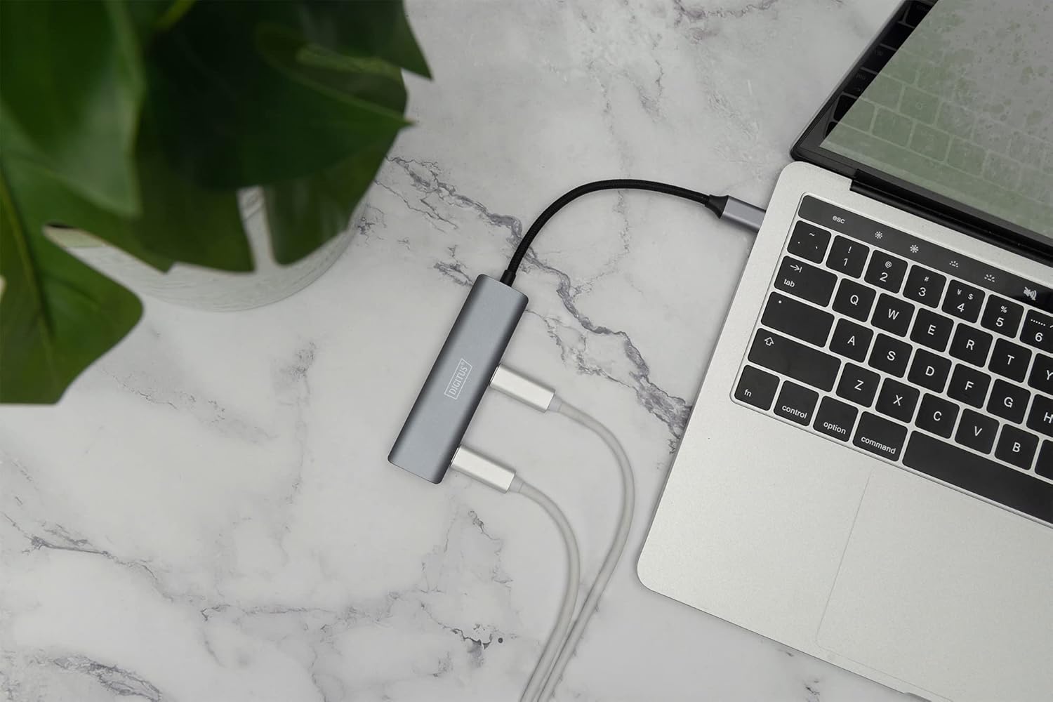 With the DIGITUS USB-C 4-port hub, you can extend your existing laptop by 4 additional USB-C ports. Use up to four additional USB devices, such as hard drives or USB sticks on your laptop. Thanks to its slim design, the 4-port hub is the ideal companion when travelling, but also indispensable in the home and office.