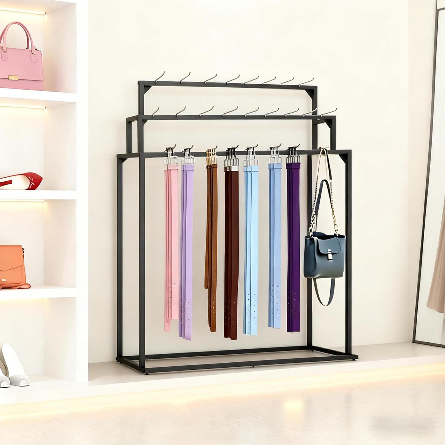 This display rack is designed to showcase belts on both sides, maximizing display capacity while saving space. Its sturdy construction ensures stability, and the open design allows customers to easily view and select items. Ideal for retail stores, fashion boutiques, department stores, and trade shows. Shipping box measures: 44.7"W × 17.1"H × 2"D, with a gross weight of 27.8 pounds Overall dimensions: 43"W X 59"H X 15.7"D. Features 24 hooks, each 3.5" long, spaced 5" apart horizontally. The lower hooks are positioned 43" from the floor, and the upper hooks are positioned 59" from the floor Constructed from sturdy metal tubing and wire, this display rack is finished with a high-quality black powder coating that resists scratches, chips, and rust. The durable finish not only provides long-lasting protection but also gives the rack a sleek, professional look suitable for both retail and commercial environments