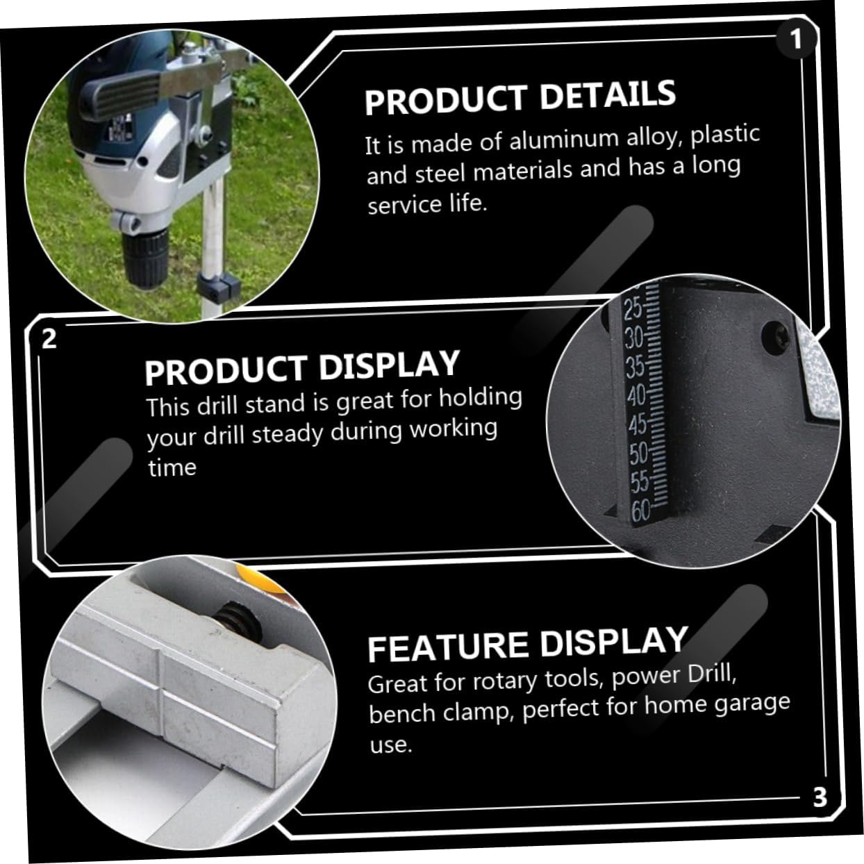 Package List 1 x bracket 1 x flat nose pliers 1 x wrench 1 screws Characteristics - Size: About 50.00X14.50X14.50cm/19.65X5.70X5.70inch Drill Press Stand. - Material: Aluminum alloy, plastic, steel Bench Clamp Support Tool. - Adjustable clamping range: 38mm-42mm Table for Drill Press. - Color: Silver Bench Clamp Rack. - This drill stand allows for much more accurate drilling than hand-held operation Single Hole Drill Rack. - This is a new adjustable drill stand, for shop or home use, hobby tools Drill Press Holder. - It is made of aluminum alloy, plastic and steel materials and has a Bench Clamp Holder. - Great for rotary tools, power Drill, bench clamp, for home garage use Universal Drill Stand. - This drill stand is great for holding your drill steady during working time Drill Press TableGoods InformationDrill Press Rack This accessory is great for any DIY lover or professional.Universal Drill Stand The drill press stand is a professional-grade tool, great for holding your drill steady during use, allowing for much more accurate drilling than hand-held operation.Single Hole Drill Rack Designed for use with any power drill with collar diameter ranging from 38mm to 42mm
