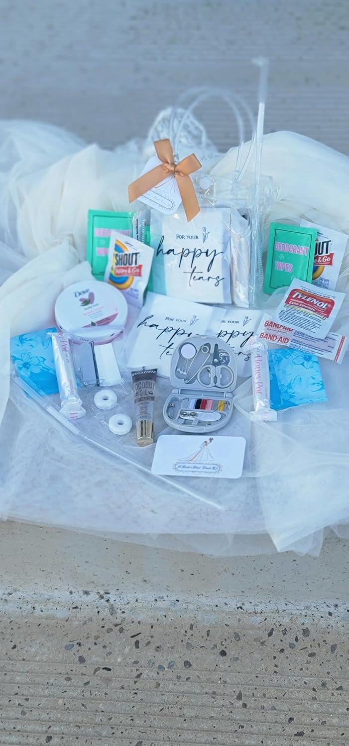 Anything can go wrong at a wedding - Tears, headache, mother nature. A Brides Final Touch Kit has you covered! Tackle last minute wedding emergencies like a pro with the ready-to-use emergency kit for Brides that comes with 20 essential items to keep you prepared for your big day. Hand picked and well-thought through beauty, fashion and first aid essentials such as lip gloss, emery board, earring backs, sewing kit, safety pins, double-sided tape, stain remover, deodorant towelette, pain reliever, mints, adhesive bandage, facial tissue, bobby pins, extra buttons, lotion, drinking straw, feminine hygiene products - all emergency items that can truly save the day. The clear bag with handle so cute and convenient spreading wedding vibes like never before. What's more - you can use the bag after the wedding as toiltery bag for work or travel. This wedding day survival kit is both practical yet funny and makes for the perfect kit to hand over to your bridesmaids, maid of honor and friends. Make sure your wedding party is prepared for the worst.
