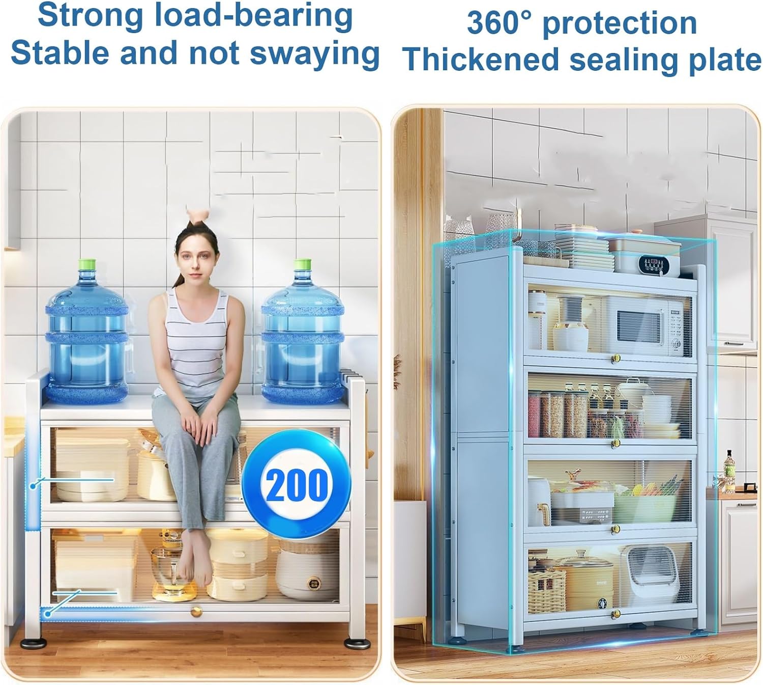 kitchen storage rack:Kitchen pantry cabinet with glass doors is perfectly meet your needs of large storage capacity and exquisite appearance! Store mugs, Cutlery and pots and pans, coffee maker, toaster or Micro-wave oven inside the cabinet, providing maximum storage space. At the same time, this helps to keep your home looking clean, organized, and clutter-free. Features High quality materials, good durability Available in a variety of sizes to meet your needs Large storage space for many items Visual cabinet doors help find what you need quickly Waterproof surface, easy to clean and maintain The flip plate effectively blocks dust and ensures the cleanliness of stored items Universal wheels can move freely to anywhere The elevated cabinet bottom design prevents dust accumulation. Product Details: Color: White, Gray Material: Stainless steel Number of Shelves: 3, 4, 5, 6 Assembly Required: Yes Each Shelf Max Load Capacity: 44 kg/88 lbs Overall Size(W)*(D)*(H): 3-tier: 60*40*102 cm/24*16*40 in, 80*40*102 cm/31*16*40 in, 100*40*102 cm/39*16*40 in 4-tier: 60*40*135 cm/24*16*53 in, 80*40*135 cm/31*16*53 in, 100*40*135 cm/39*16*53 in 5-tier: 60*40*173 cm/24*16*68 in, 80*40*173 cm/31*16*68 in, 100*40*173 cm/39*16*68 in 6-tier: 60*40*193 cm/24*16*76 in, 80*40*193 cm/31*16*76 in, 100*40*193 cm/39*16*76 in Package Includes: 1 x Kitchen shelf 4 x Universal wheel 4 x Cabinet side Hooks