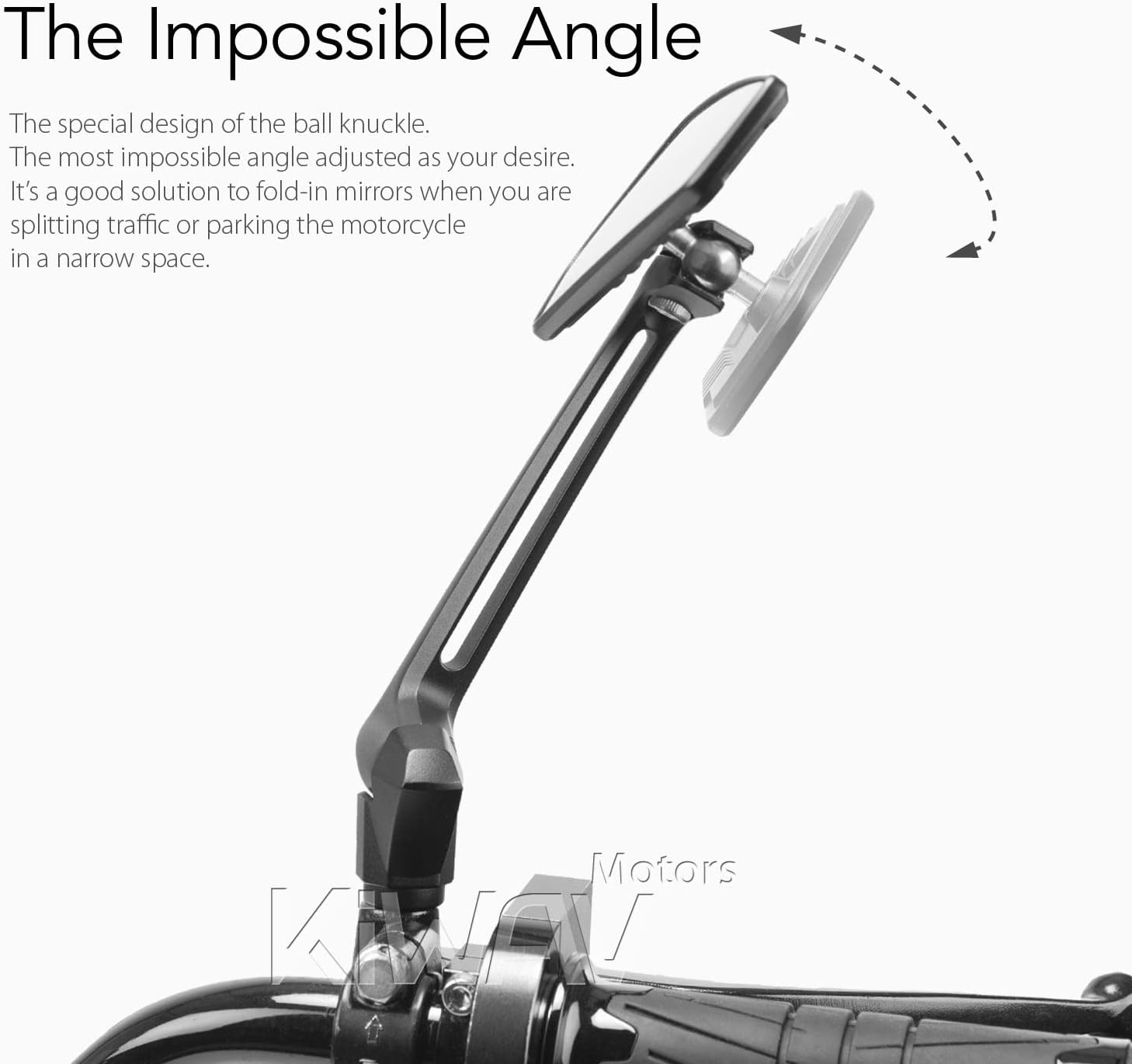 Features: 1. Unbelievably thin aluminum mirror plate. Every part of the plate can't be thinner and still has enough space to put a convex glass on! 2. Unique patented adjust-and-stop Teflon(PTFE) bushing joint. On the road, you can easily adjust the mirror plate with your bare hand and don't have to worry about it goes messing around. 3. Minimal design. 4. The special design of the ball knuckle - The most impossible angle adjusted as your desire. It's a good solution to fold-in mirrors when you are splitting traffic or parking the motorcycle in a narrow space. 5. Glass mirror - better scratch resistance than non glass one. 6. It fits perfectly most ebikes and bicycles. The eye-catching design and high-quality aluminum give your bike an individual character. Material: Aluminum Mirror Glass: Chrome convex lens Mirror Color: Black Adjustment: Highly adjustable Weight: n.w.: 505 g./ 1.11 lbs. (pair), g.w.: 640 g./ 1.41 lbs. (total package, packing inclusive) Package: A pair of mirrors (left hand / right hand), 10mm standard thread bolt x 2 PCS, 10mm reverse thread bolt x 1 PC, handlebar mount clip x 2 PCS Compatibility: Universal fit for Ebikes, Escooters, bicycles with a 7/8 inch (22mm) handlebars (mount area). 10mm(1.25 pitch): Universal fit for most 10mm mirror thread Note: Because of the small dimensions of the mirror glass, this product must only be fitted for racing or show purposes.