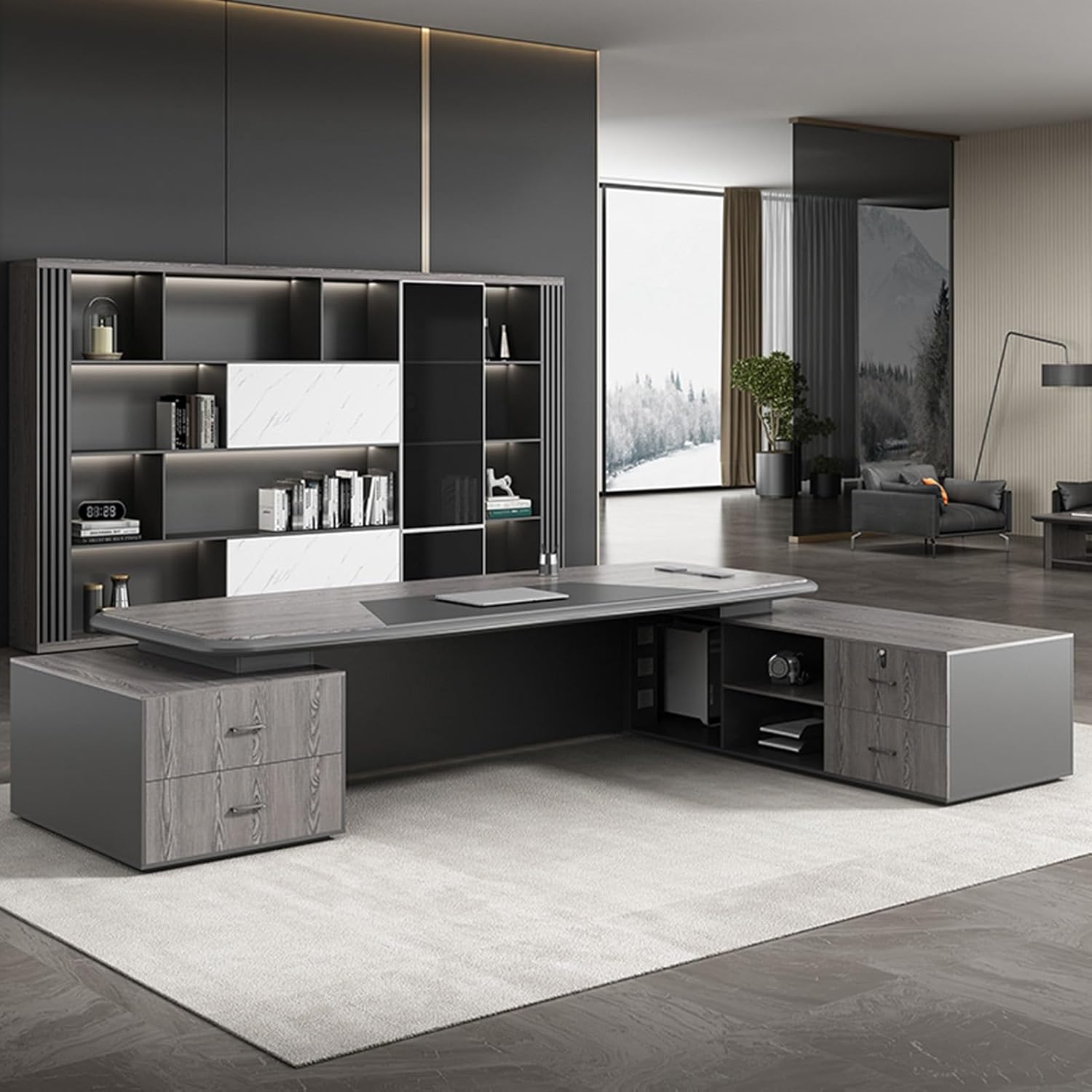 Product Dimensions: 87"L x 71" W x 29.5"HColor: BrownStyle: ModernBase Material: Wooden LegsTop Material Type: WoodFinish Type: WoodSpecial Feature: L-ShapedRoom Type: Office, Bedroom, Study RoomRecommended Uses for Product: WorkingPackage List:Executive Desk x1Installation Accessories x1
