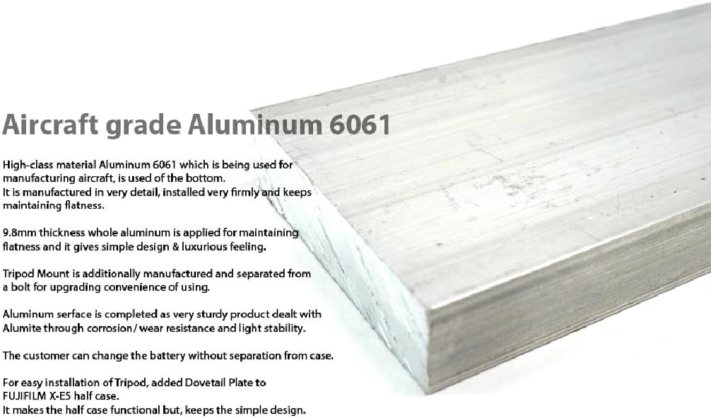 BADALASSI CARLO Company. -As the feature of Art. Minerva Box is milling typed and has natural embossing pattern on the surface. -Put some leather and chemicals into big drum and rotate it for certain time. -Then leathers get some frictions each other and it makes natural embossing partially. -This embossing is different from artificial one but very shown partially & naturally. -It is full vegetable leather and it keeps much oil in. -As much as you use the case, it will be glossy and you will see unique character from the leather. Aircraft grade Aluminum 6061 ✔️ High-class material Aluminum 6061 which is being used for manufacturing aircraft, is used of the bottom. It is manufactured in very detail, installed very firmly and keeps maintaining flatness. ✔️ 9.8mm thickness whole aluminum is applied for maintaining flatness and it gives simple design & luxurious feeling. ✔️ Tripod Mount is additionally manufactured and separated from a bolt for upgrading convenience of using. ✔️ Aluminum surface is completed as very sturdy product dealt with Alumite through corrosion/ wear resistance and light stability. ✔️ The customer can change the battery without separation from case. ✔️ For easy installation of Tripod, added removable Dovetail Plate to FUJIFILM X-E5 Half case. ✔️ It makes the half case functional but, keeps the simple design.
