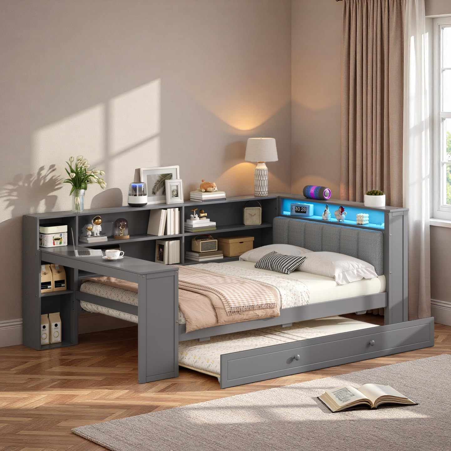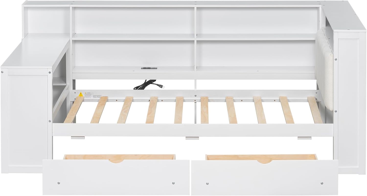 Maximize your room with this multifunctional corner daybed that combines comfort, storage, and workspace in one elegant design. Featuring a built-in desk, storage drawers, and open shelves, it provides the perfect balance between style and practicality—ideal for bedrooms, guest rooms, or small apartments. Overall Dimensions: 98.4''L x 50.1''W x 40.4''H (Twin) / 98.4''L x 65.3''W x 40.4''H (Full) Bed Inner Space: Twin / Full Recommended Mattress Thickness: 6'' Bed Weight Capacity: 350LBS / 550LBS Overall Product Weight: 178LBS / 202LBS Color: White / Grey Material: MDF + Plywood Level of Assembly: Full Assembly Needed Suggested Number of People: 2 Additional Tools Required: All Tools Included Number of Package:2 Country of Origin: Viet Nam