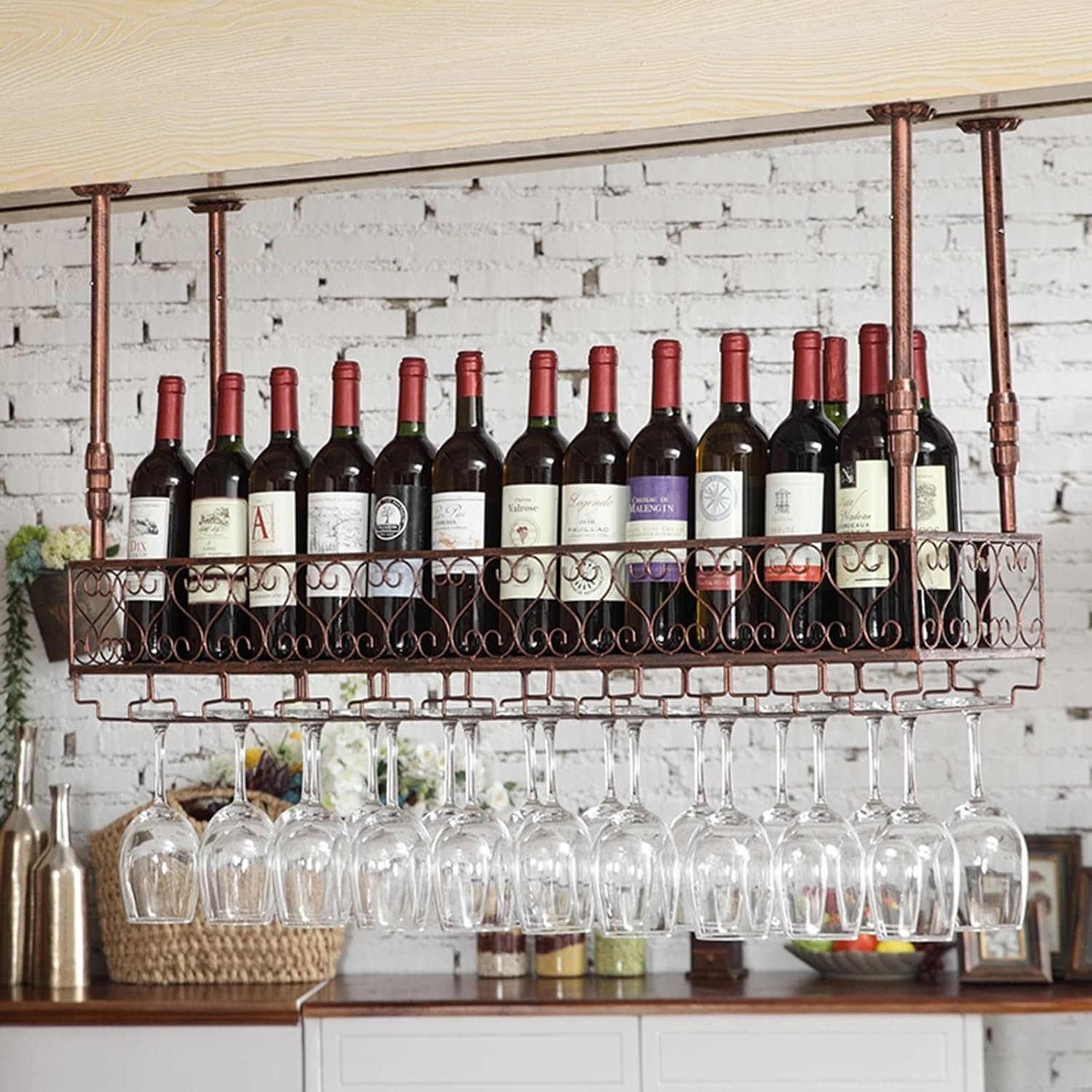 Feature:Hanging wine rack/ceiling: modern style iron hanging wine glass rack ceiling decoration rack, suitable for bar, dining room, living room, kitchen, bedroom, study room, coffee shop or wine cellar, also can be used as home decorationExcellent storage shelf saves space and excellent container, with charming colors and chic design make your room the focal point.Product Details:Product name: flower rack/wine rack/ceiling rackMaterial: ironProduct weight: 3kg,4kg,4.5kg,5.5kgMaximum product load: 100KG/220LbsPacking: iron frame, pine board, screws and other accessoriesSize: 60CM , 80CM , 100CM,120cmNotice:1. This package only contains this product and does not contain any decorative elements related to pictures2. The products are taken in kind, but there may be differences due to light, equipment, angle of view and computer resolution, real objects and photos, etc., the actual object shall prevail, and the pictures are for reference only