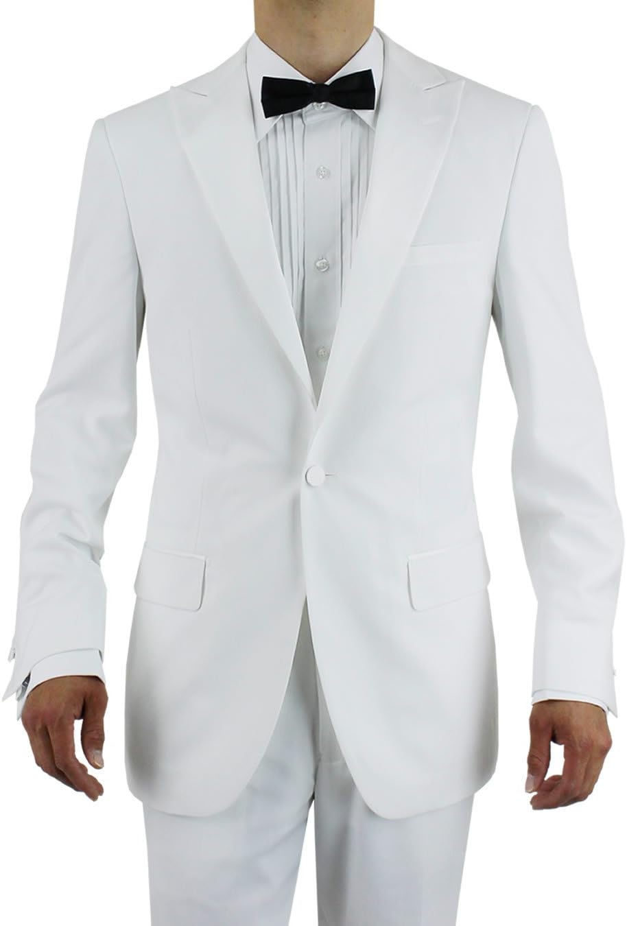Giorgio Napoli Men's One Button Tuxedo. JACKET: 1 button single breasted jacket front, dual side vents, peak lapel, full lining matching the color of the suit, 3 exterior pockets - 2 with flaps. The suit comes with 4 button vented sleeves. The pants, lapels, and buttons have satin detailing/lining. PANTS: Flat front dress pants lined to just below the knee. Pant leg length unhemmed. These pants come with a standard 6" drop in the waist (e.g. a US 40R jacket will come with 34" waist pants). The waist can be altered in or out up to 2 inches. This suit is factory packed with a hanger and all tags are in place. Fine tropical weight man made fabric T/R - 65% Poly 35% Viscose. Imported China. Dry clean only. Please note: This tuxedo comes with an adjustable waistband and an extra suspender button.