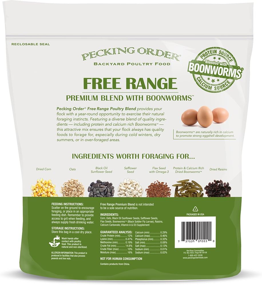 Whether you care for three hens or thirty, allowing your flock to free range outdoors provides chickens the opportunity to exercise their natural instincts to forage for food. However, during the winter, dry climates, & other conditions, there is often less for your flock to forage for & that's were free range poultry blend from Pecking Order can help. Our premium free range poultry blend can be scattered around the yd to provide a variety of tasty seeds, grains, raisins, & dried insects that your flock will love to forage for!