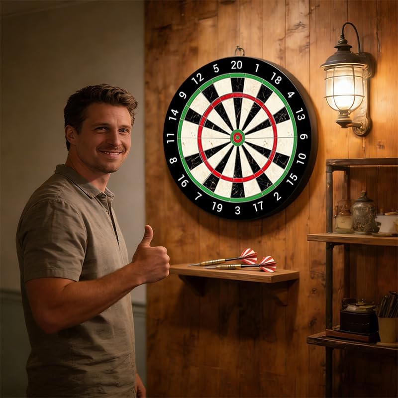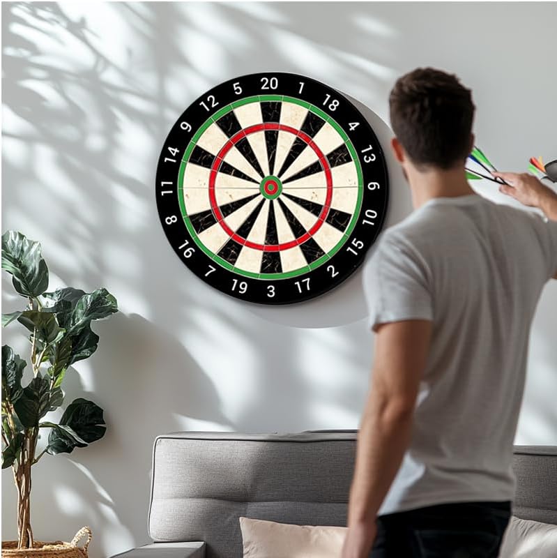 This professional dartboard brings the excitement of competitive darts right into your home. Measuring 17.27 inches in diameter with a 0.98-inch depth, it provides a regulation-size playing surface perfect for serious players and casual enthusiasts alike. The classic design features traditional green, red, black, and cream segments with clearly numbered scoring zones from 1-20, plus the iconic bullseye center. This complete set includes 6 darts, so you can start playing immediately. The standard configuration supports all popular dart games including 301, 501, Cricket, and Around the Clock, offering endless entertainment possibilities. Designed for easy wall mounting, this dartboard transforms any space into an instant game center, making it ideal for game rooms, basements, offices, or recreational areas. The bold numbers and contrasting colors ensure excellent visibility from across the room during competitive play. Whether you're hosting game night with friends or practicing your aim solo, this dartboard combines functional gaming equipment with eye-catching wall decor that adds character and entertainment value to your space.