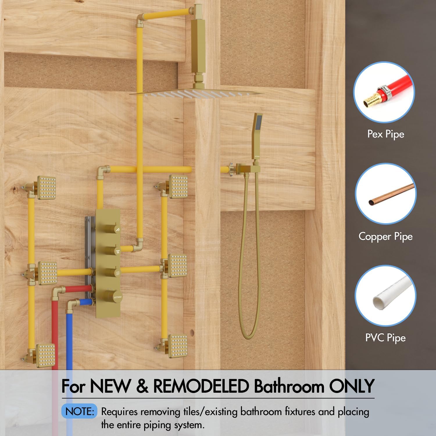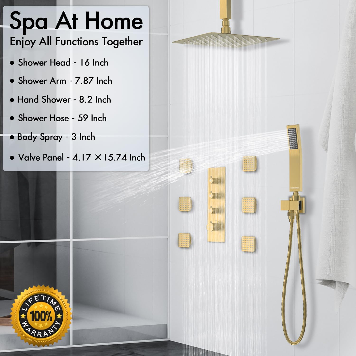 | Included Components | 1 × 16-inch Square Rain Shower Head (304 stainless steel), 1 × 6 PCS Body Jets (Brass), 1 × Handheld Shower Head (Brass), 1 × Shower Arm (Brass), 1 × Thermostatic Valve (Brass) |
