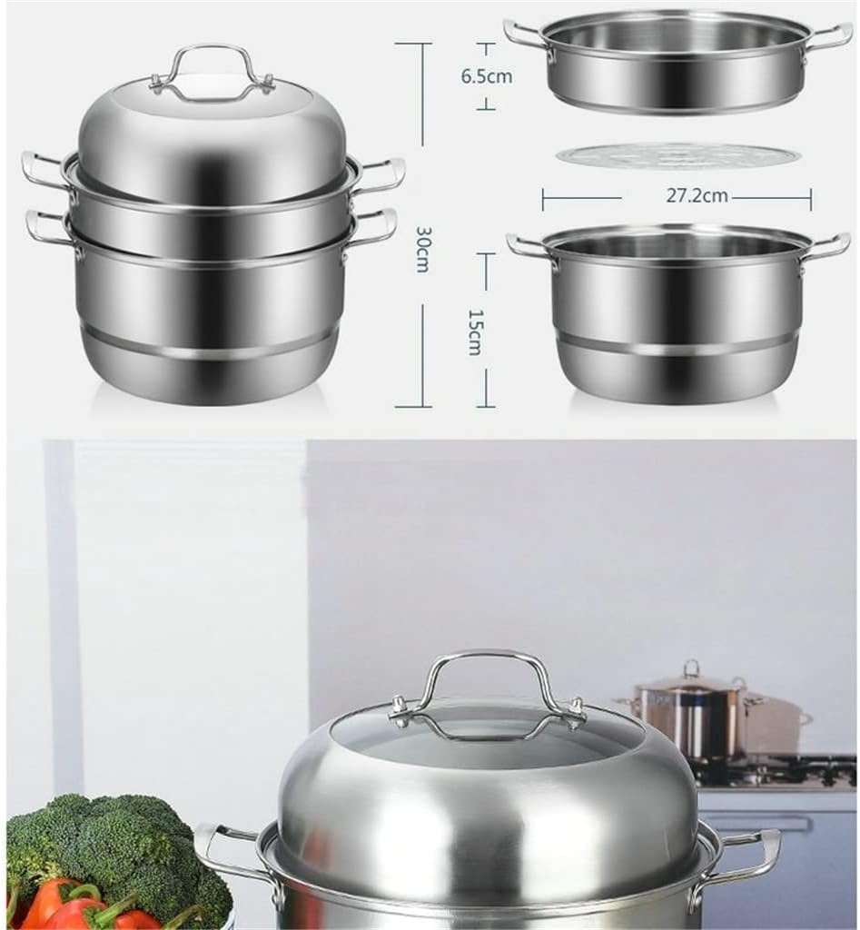 DescriptionMaterial:Stainless steelColor: SilverSize:2 Tier:24(High)*27.2(Diameter)cm3 Tier:30(High)*27.2(Diameter)cmPackage Included:1 x SteamerNote:Please allow minor deviation due to manual measurement.Due to the difference between different monitors, the picture may not reflect the actual color of the item.Not easy to rust and easy to clean.