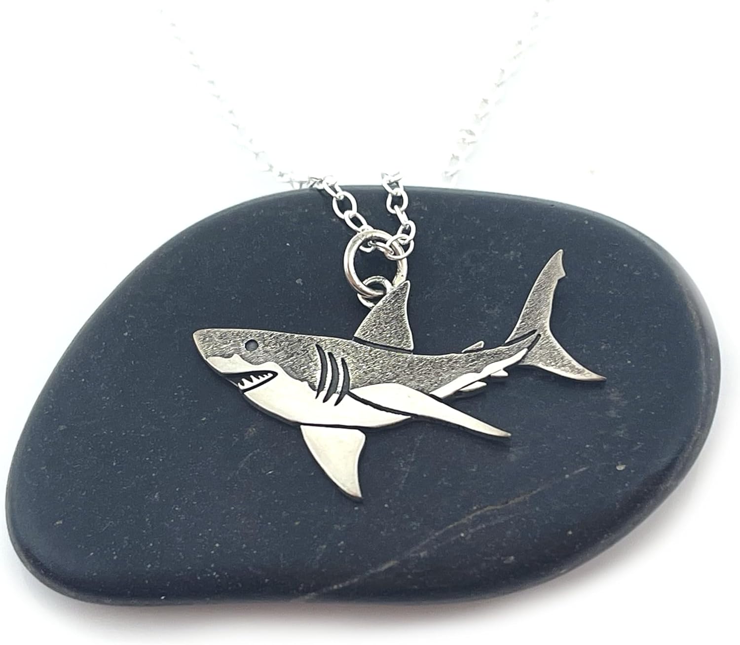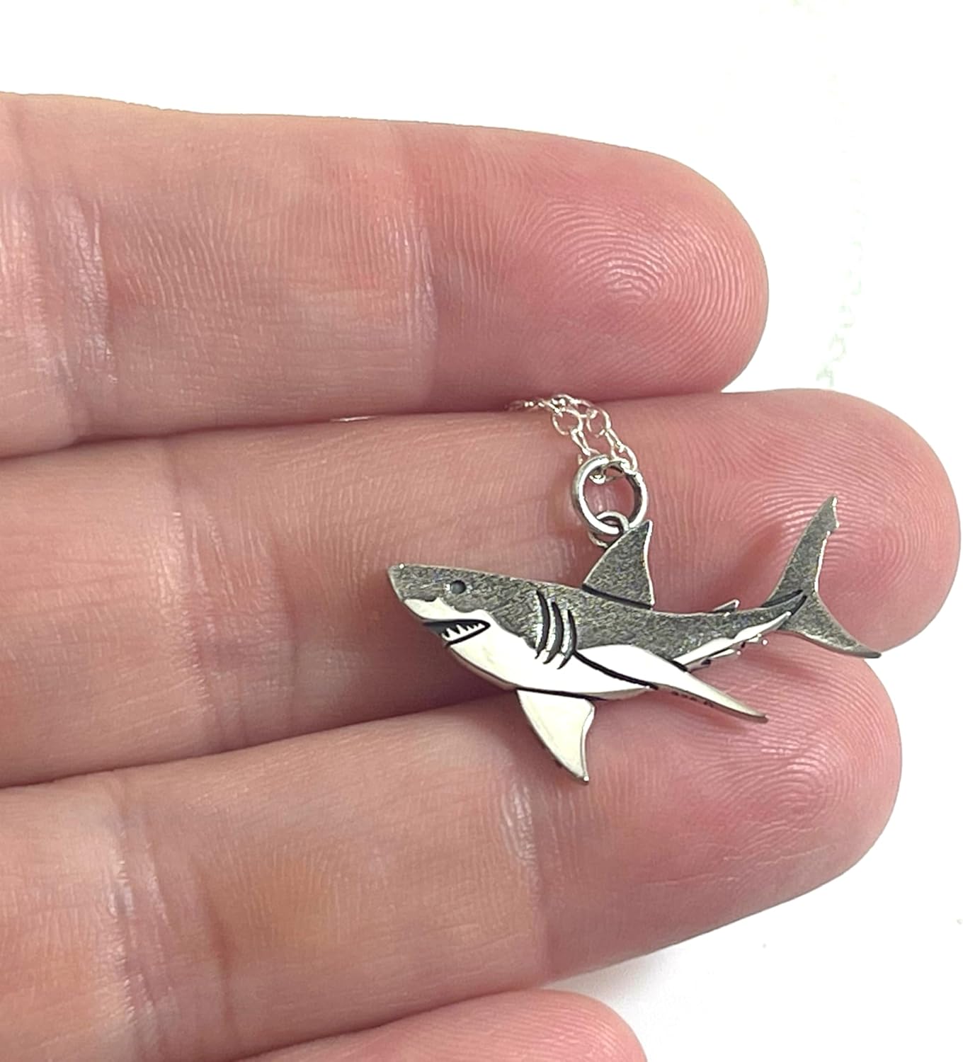 This sterling silver great white shark necklace is the perfect piece for ocean lovers, shark enthusiasts, and anyone who loves bold, unique jewelry. The detailed shark charm measures 19x26mm and hangs from an 18 inch sterling silver cable chain with a secure spring ring clasp. Handmade in Raleigh, NC, this necklace arrives gift-ready and makes an unforgettable present for birthdays, beach trips, or anyone obsessed with marine life.