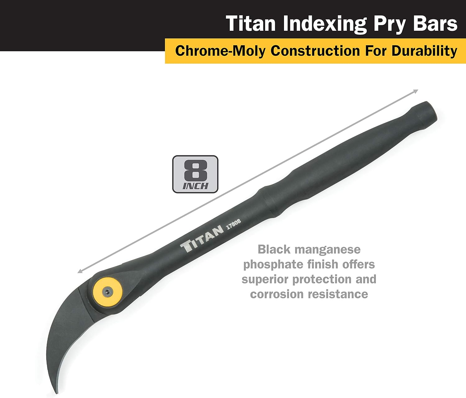 Titan Tools 17808 8-Inch Indexing Pry Bar is constructed of chrome-moly with a black manganese phosphate finish. Overall length is 8-Inch and foot width is 5/16-inch. Indexing range is 180-Degrees; head rotates 180 degrees and locks at eleven incrementally fixed angles 16. 4 degrees apart. Indexable pry bar features a quick-lock thumb knob for quick and easy lock and release of pry head. Rolling head pry bar is made in Taiwan.