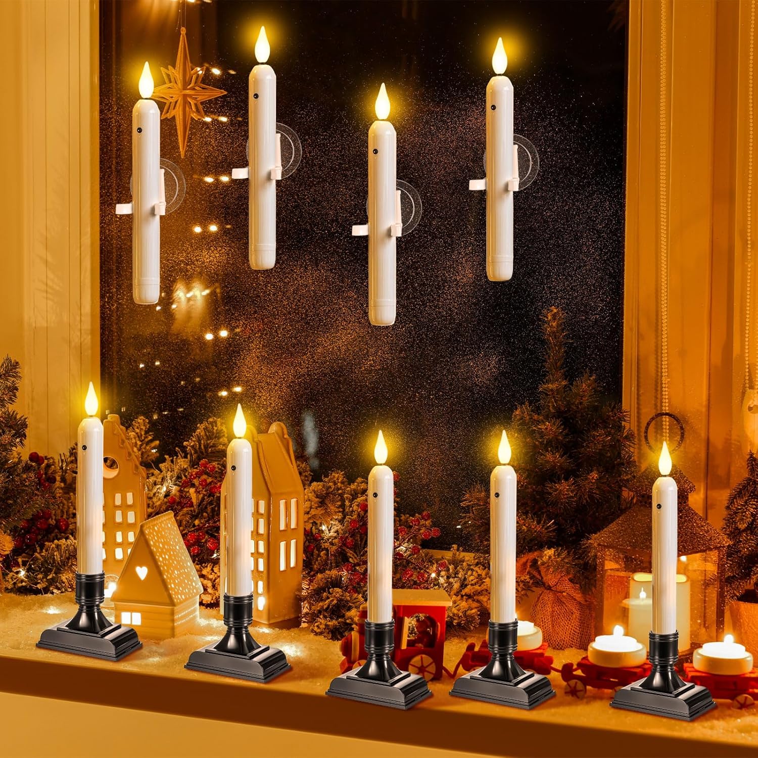 • Flameless and Safe: you will receive 12 led window lights with 12 black candle holders and 12 transparent suction cups, made of plastic, with soft flickering effect and warm yellow light design, allowing you to enjoy the light of real candles without worrying about fire risks
